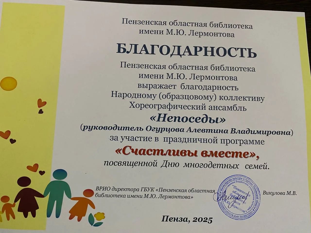 21 сентября в Областной библиотеке им М. Ю. Лермонтова прошла праздничная программа ко Дню многодетных семей «Счастливы вместе». Народный( образцовый) коллектив хореографический ансамбль «Непоседы» МБОУ ДО ДЮЦ « Звёздный» г Пензы поздравил всех гостей праздника яркими танцевальными номерами. Такие праздники подчеркивают важность семейных ценностей, укрепляют социальный статус многодетных родителей и создают атмосферу радости и единства.