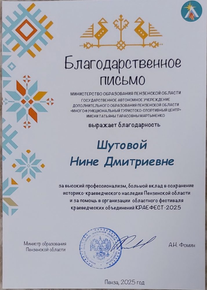 Педагог Шутова Нина Дмитриевна и концертмейстер Исаев Сергей Николаевич отмечены благодарственным письмом Министерства образования Пензенской области за высокий профессионализм, большой вклад в сохранение историко-краеведческого населения Пензенской области и за помощь в организации фестиваля.
