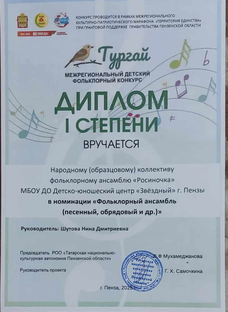 По итогам конкурса Народный (образцовый) коллектив фольклорный ансамбль «Росиночка» МБОУ ДО ДЮЦ «Звёздный» г Пензы в номинации фольклорные коллективы стал лауреатом 1 степени и обладателем подарочного сертификата.