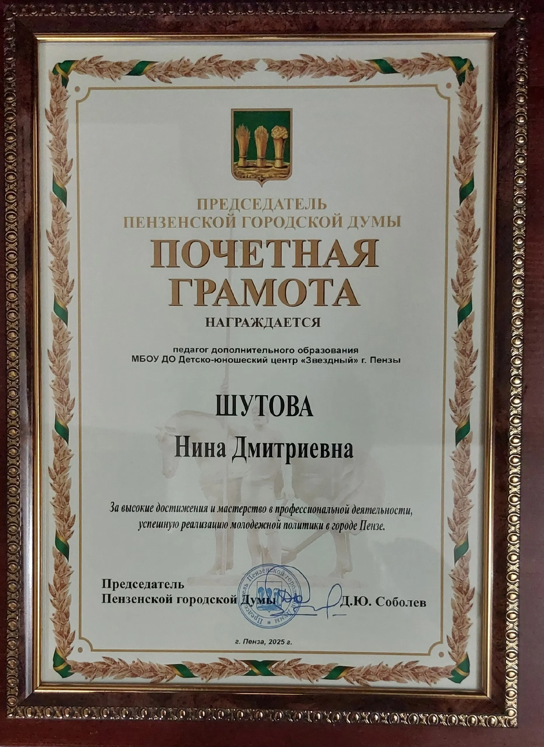 Педагог Шутова Нина Дмитриевна отмечена Почетной грамотой Председателя Пензенской Городской Думы.