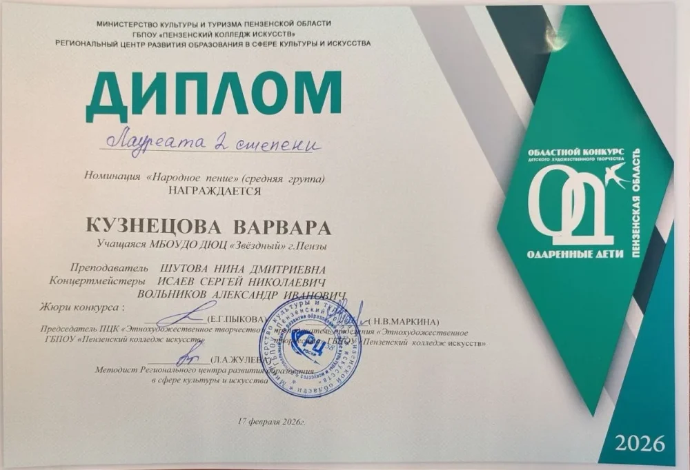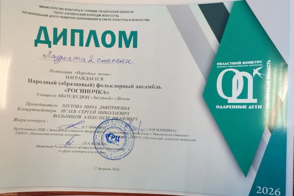 В конкурсе достойно выступил Народный (образцовый) коллектив — фольклорный ансамбль «Росиночка». В упорной борьбе среди музыкальных школ и школ искусств города Пензы в номинации «Народное пение» коллектив и солисты продемонстрировали высокий уровень подготовки и исполнительского мастерства.