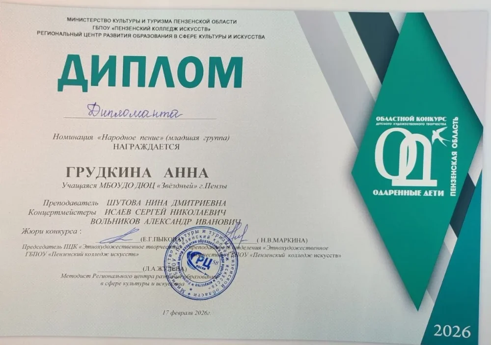 • Анна Грудкина — дипломант I степени (младшая возрастная категория);
