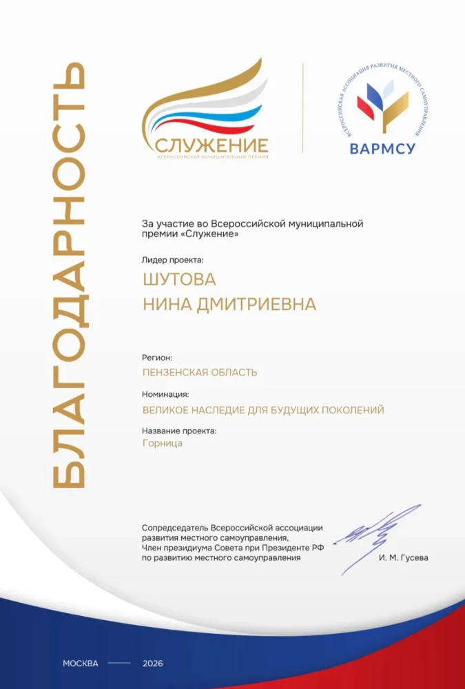 Педагог дополнительного образования, руководитель Народного (образцового) коллектива фольклорного ансамбля «Росиночка» Шутова Нина Дмитриевна приняла участие во II Всероссийской муниципальной премии «Служение» в номинации «Великое наследие — для будущих поколений», представив социально-культурный проект «Горница».