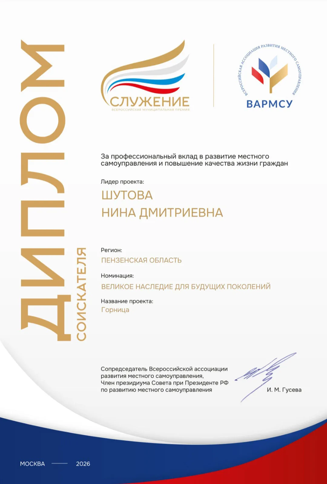 В финал номинации вышли лишь 10 проектов. Несмотря на высокую конкуренцию, проект «Горница» получил высокую оценку экспертного сообщества. По итогам участия Нина Дмитриевна была награждена дипломом и благодарностью за значительный профессиональный вклад в развитие местного самоуправления, сохранение культурного наследия и повышение качества жизни граждан.