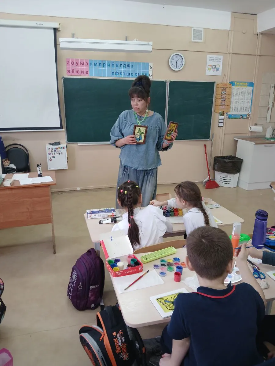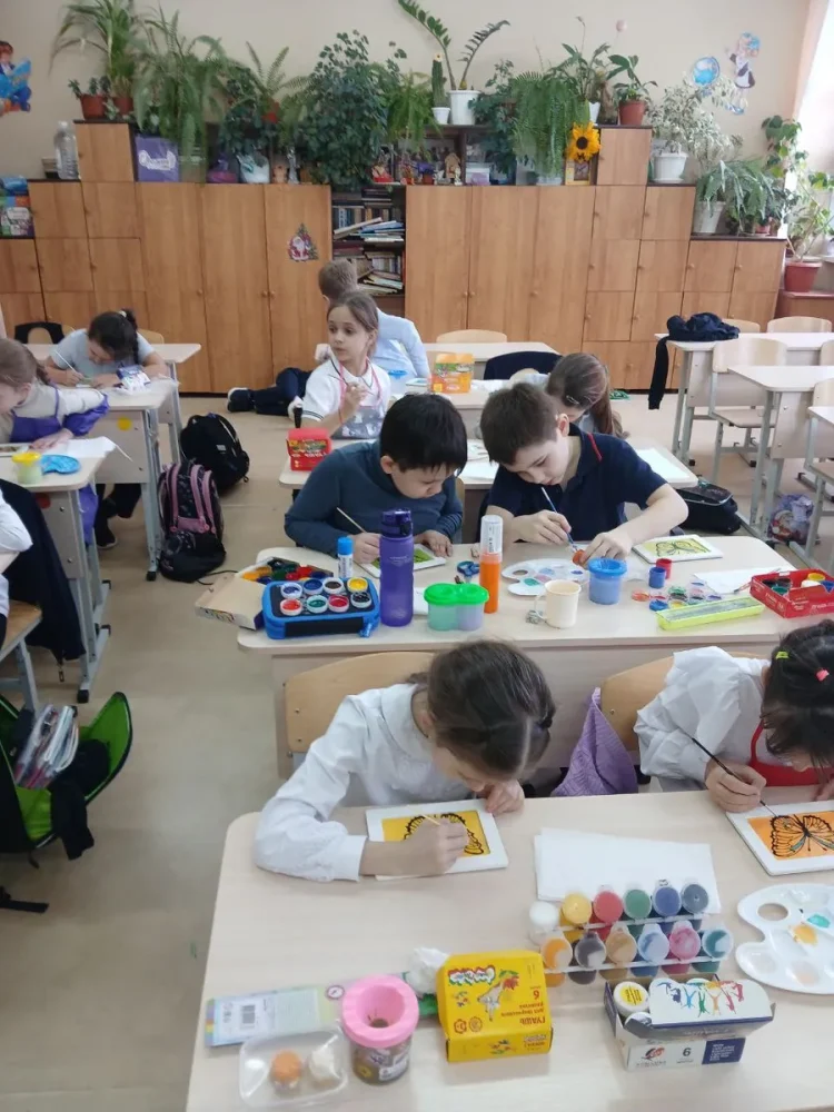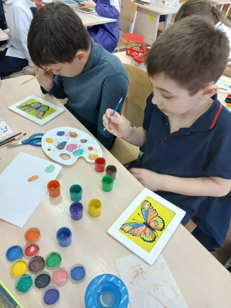 Перед учащимися лежали гладкие стекла, баночки с яркими красками и кисточки разных размеров. Сначала робко, потом смелее ребята начали рисовать собственные сюжеты. Некоторые изображали нежные цветы, дарящие тепло весной, другие создавали фантастические узоры.