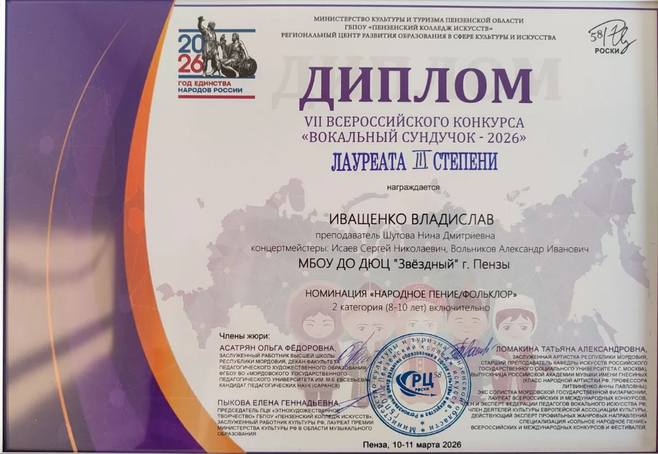 10 марта в Органном зале Пензенской областной филармонии состоялись конкурсные прослушивания участников VII Всероссийского конкурса вокальных исполнителей «Вокальный сундучок-2026». Юные исполнители со всей области продемонстрировали своё мастерство в области музыкального искусства в очном формате в номинации «Народный вокал».