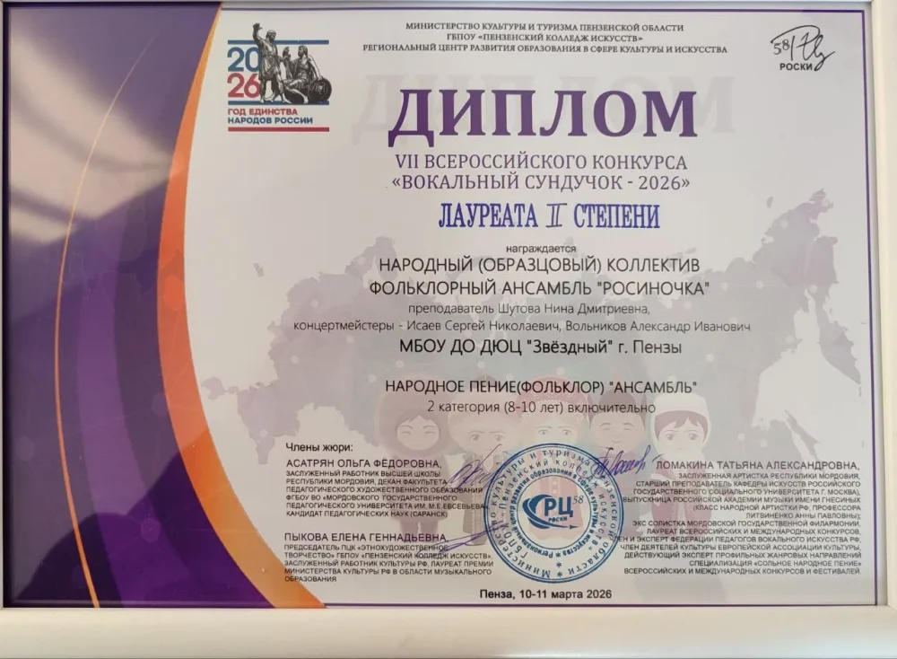 В напряжённой творческой борьбе с учащимися детских школ искусств, музыкальных школ города Пензы и Пензенской области ансамбль «Росиночка» стал лауреатом II степени в возрастной категории 8–10 лет.