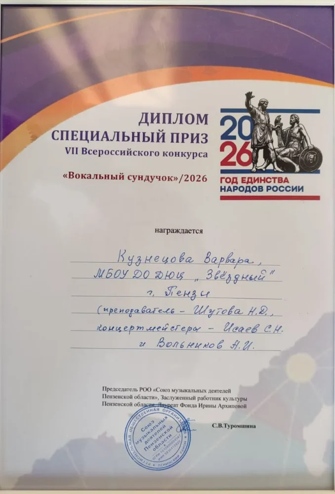 - Варвара Кузнецова — лауреат I степени и обладатель специального приза Творческого союза, подготовленного к 100-летию И.К. Архиповой. Награду вручила С.В. Туромшина — председатель РОО «Союз музыкальных деятелей Пензенской области», заслуженный работник культуры Пензенской области, лауреат Фонда Ирины Архиповой.