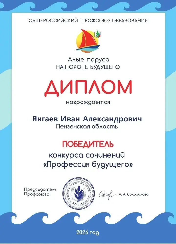 В рамках конкурса участники писали сочинение на тему «Профессия будущего» и представляли портфолио своих достижений. Иван достойно справился со всеми испытаниями и был награждён Дипломом, а также путёвкой во Всероссийский детский центр «Алые паруса» (г. Евпатория, Республика Крым), где с 20 апреля по 15 мая 2026 года пройдёт тематическая смена «На пороге будущего».