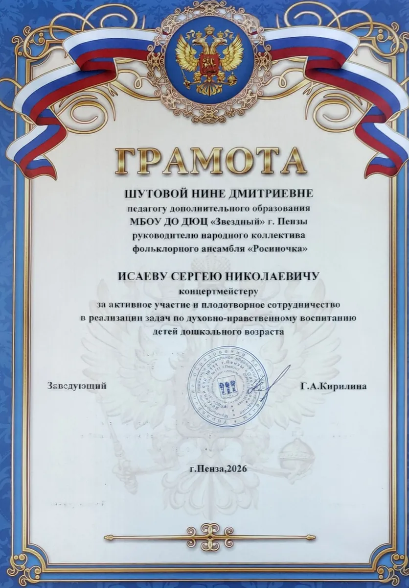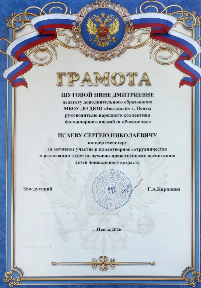 Педагог Шутова Нина Дмитриевна и концертмейстер Исаев Сергей Николаевич были отмечены благодарностью за активное участие и плодотворное сотрудничество в реализации задач духовно-нравственного воспитания детей дошкольного возраста.